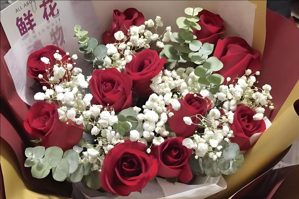 玫瑰:从表白用的香槟玫瑰到热烈红玫瑰,11朵起步的经典搭配,还能加尤加利叶提升高级感。